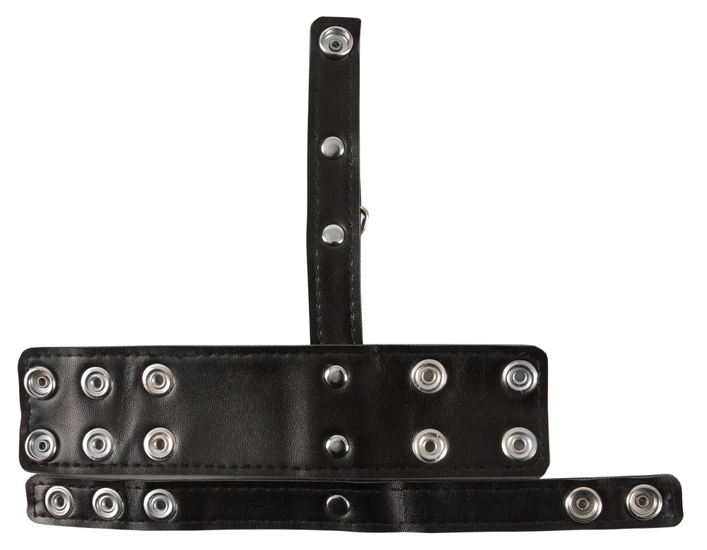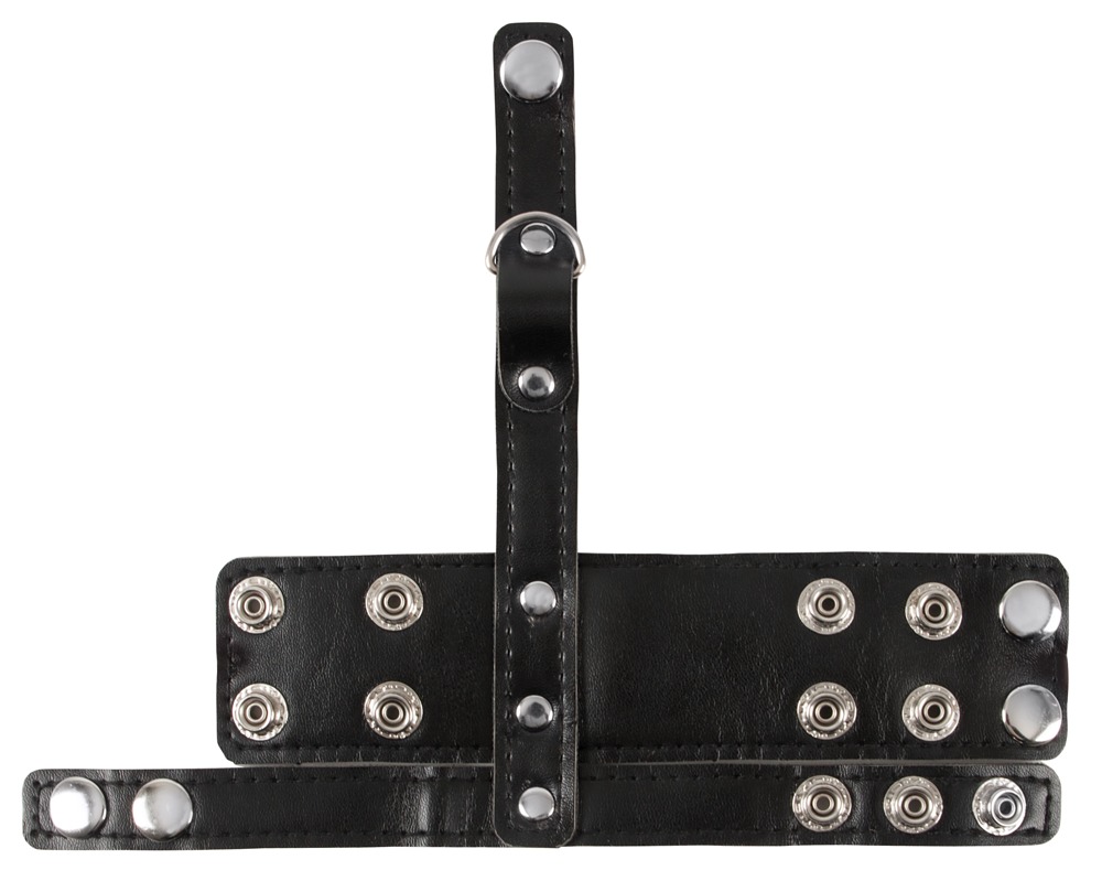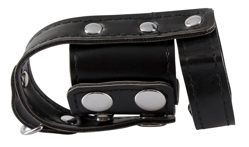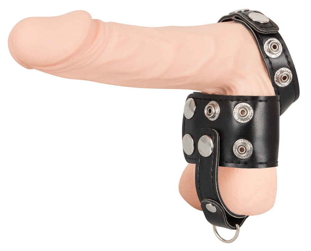 Penis- und Hodenriemen mit Hodenteiler in maskuliner Lederoptik. Mit D-Ring am Hodenteiler zum Anhängen von Gewichten (nicht beiliegend) oder einer Führungsleine (nicht beiliegend). Alle Riemen und der Teiler sind vielfach mit Druckknöpfen für perfekte Passform verstellbar.