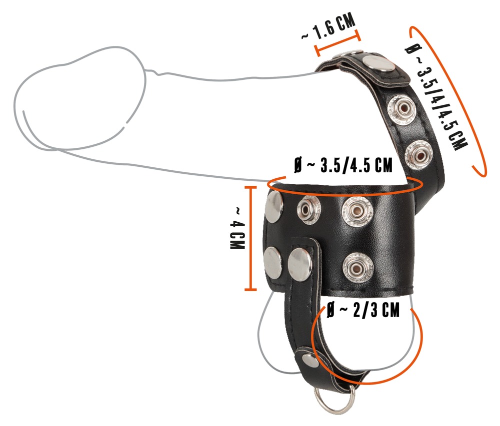 Penisriemen 1,6 cm breit, Ø 3,5 cm/4 cm/4,5 cm; Hodenriemen 4 cm breit, Ø 3,5 cm/4,5 cm, Hodenteiler 2 cm/3 cm lang. Gewicht 27 g. PU, Metall.