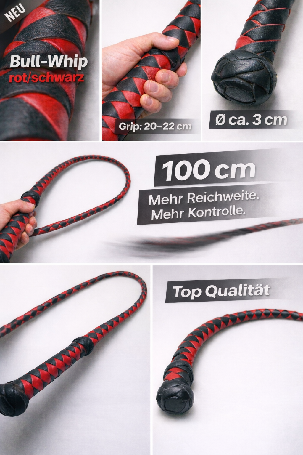 ⚠️ Achtung: Mit Whips sollte man umgehen können. Je länger die Peitsche, desto mehr Platz benötigt man zum Schlagen. Bitte immer auf ausreichend Raum und eine sichere Umgebung achten.