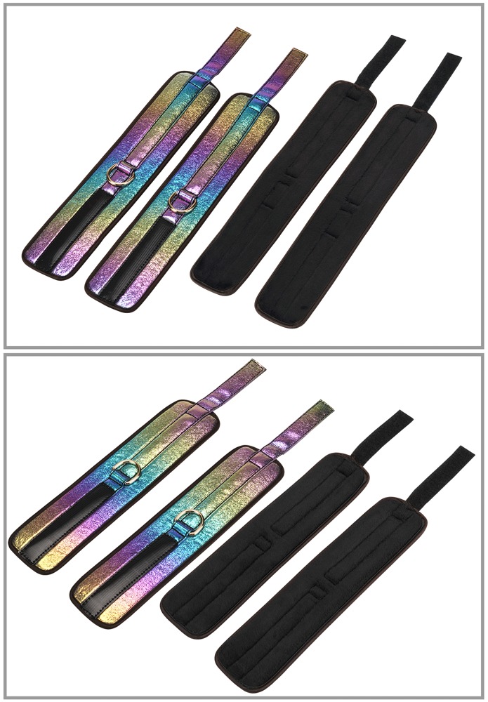 8-teiliges Bondage-Set Vivid Niji von Liebe Seele in edler Perlglanz-Optik (Glossy Multicolor) mit goldfarbenen Beschlägen und Accessoires. Ein ganz besonderes Set für Neugierige und Kenner:innen – exklusiv und von höchster Qualität! Dieses Set enthält: