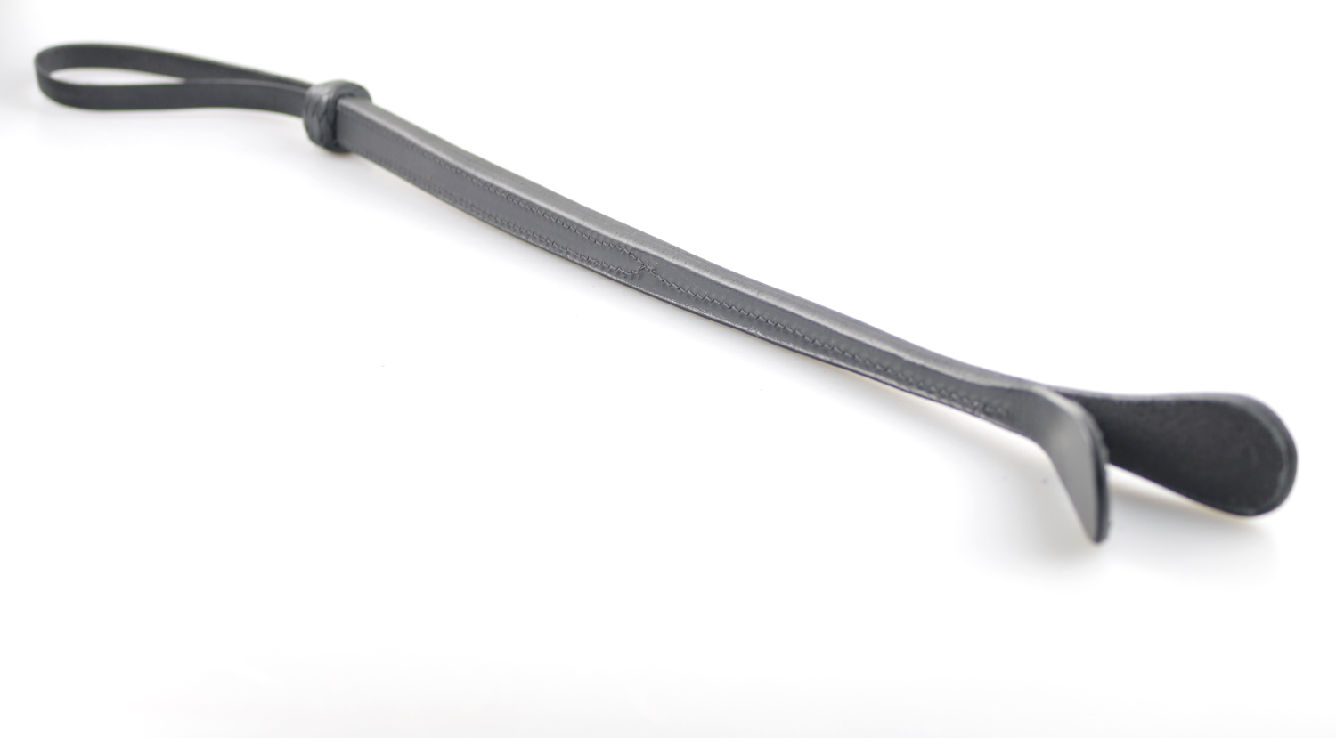 Dieses gertenschlanke Paddel aus schwarzem Leder gefertigt, ist durch seine besondere Machart sehr gut händel- und dosierbar, die doppelte Klatsche am Ende erzeugt, je nach Schlagintensität, deutliche oder dezentere Spuren.